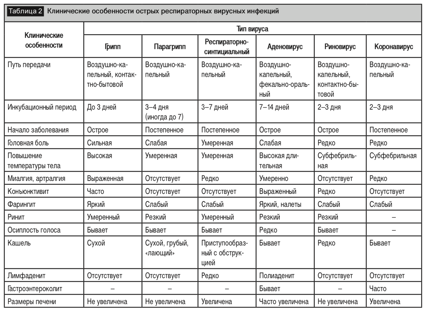 Клиническая картина ОРИ сопровождается интоксикационным синдромом (головная боль, слабость, снижение аппетита, диспепсия, миалгия, артралгия) и гипертермией. Клинические особенности острых респираторных вирусных инфекций, вызванные разными возбудителями, представлены в таблице 2 [36]. Однако типирование возбудителя в амбулаторной практике по клиническим проявлениям не всегда представляется возможным. В то же время экспрессных методов постановки диагноза для ряда возбудителей не разработано или они достаточно дорогостоящие.