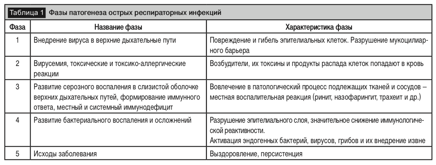 Патогенез ОРИ состоит из комплекса процессов, развивающихся на всех этапах репродукции возбудителей и их распространения в организме, а также процессов, развивающихся при взаимоотношении возбудителей с защитными системами хозяина, то есть с компонентами врожденного и приобретенного иммунитета. На внедрение возбудителя организм отвечает сложной системой защитно-приспособительных реакций, направленных на ограничение его репродукции и последующую элиминацию, а в конечном итоге, на полное восстановление возникающих структурно-функциональных нарушений (табл. 1) [30].