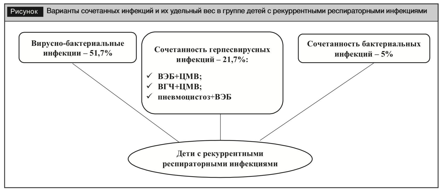 Общность путей и факторов передачи ОРИ повышает риск распространения и одновременного заражения несколькими возбудителями. Первичная тропность респираторных инфекций к клеткам дыхательной системы предопределяет поражение ее слизистой оболочки и проявления заболеваний. Вследствие видового разнообразия возбудителей, их биологических свойств, взаимоотношения друг с другом и с организмом хозяина возможно как типичное течение инфекционного процесса, так и развитие атипичной клинической картины. Предполагается, что в патогенезе сочетанных респираторных инфекций создается ситуация включения двух форм иммунного ответа, однако механизм взаимоотношений возбудителей изучен недостаточно. Особенностью современного течения инфекционных заболеваний у детей является частое сочетание этиологических факторов: вирус Эпштейна – Барр (ВЭБ), цитомегаловирус (ЦМВ), вирус простого герпеса (ВПГ), бактерий, грибов и паразитарных патогенов (рисунок) [1].